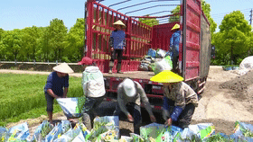 工人们将打包好的水生植物搬运上车