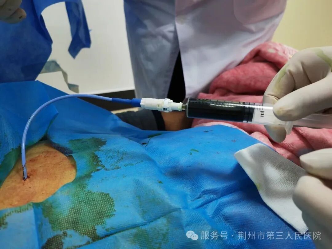 凭借多年积累的精湛技术和丰富经验,超声医学科团队在肝胆外科密切配合下,全程实时精准引导:定位、穿刺、置管一气呵成。整个手术仅耗时 30分钟,引流管顺利置入,淤积的深黄色胆汁瞬间通畅流出。术后第3天,患者总胆红素降至140μmol/L,皮肤巩膜黄染、皮肤瘙痒、下腹疼痛等症状完全缓解,家属对治疗效果赞不绝口。