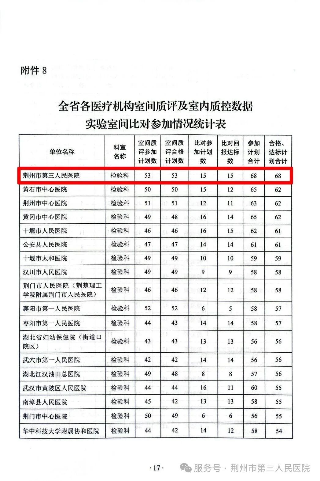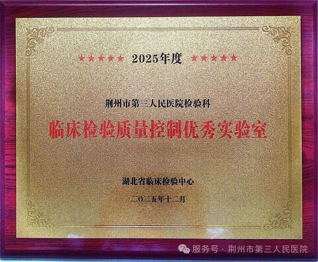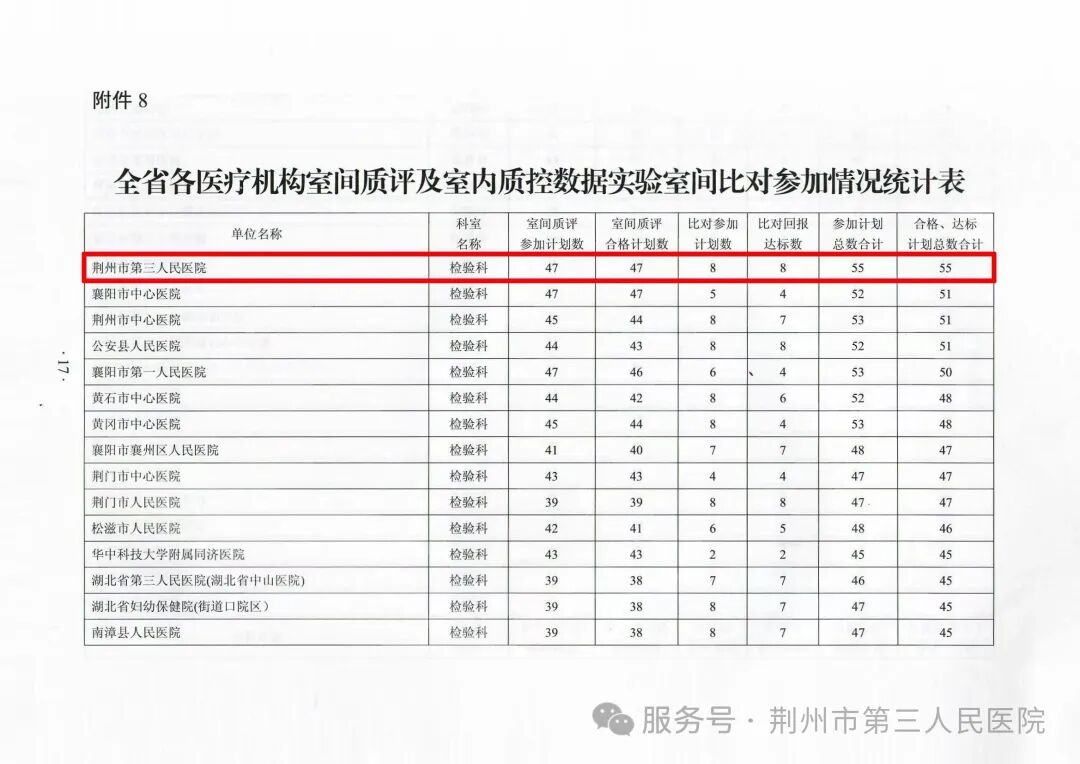 荆州市第三人民医院检验科在全省室间质评及室内质控室间比对中,以参评计划总数与合格达标总数第一的优异成绩,再次荣膺“临床检验质量控制优秀实验室”称号!
