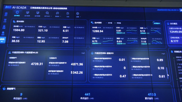 走进江陵县城区污水处理厂的控制室内,智慧大屏上各项实时指标数值清晰呈现,从进水水质、水量到氧化沟溶解氧、出水标准,全流程数据一目了然。