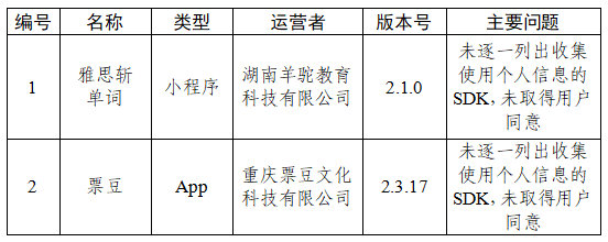 二、雅思斩单词、票豆等2款App未逐一列出收集使用个人信息的SDK,未取得用户同意(详见下表)。
