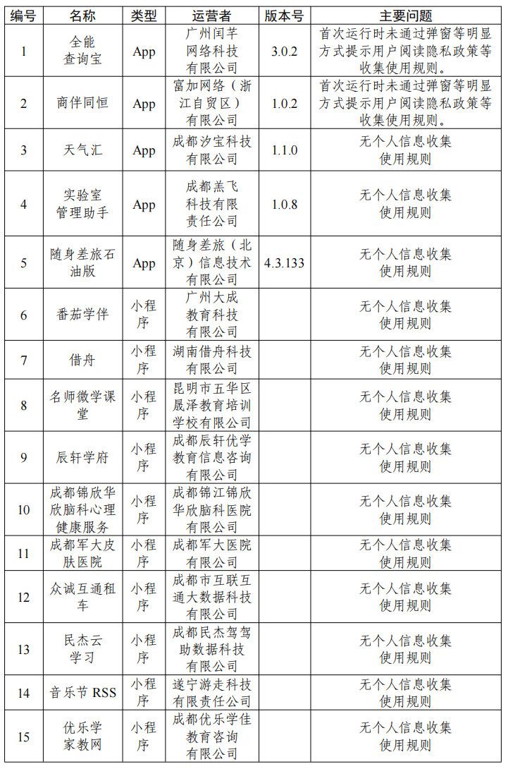 一、全能查询宝、商伴同恒等15款App无个人信息收集使用规则或在首次运行时未通过弹窗等明显方式提示用户阅读个人信息收集使用规则(详见下表)。