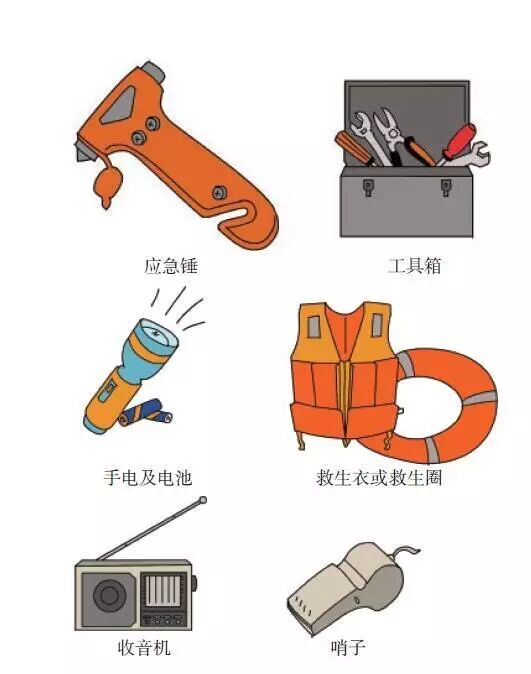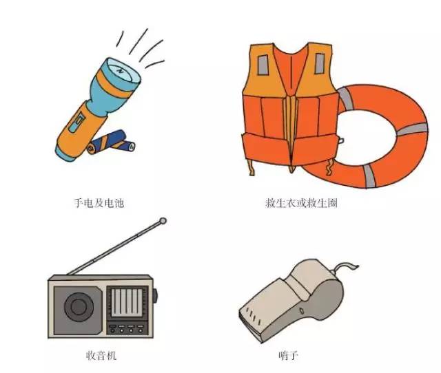 哨子、手电筒、救生衣或救生圈跟家庭常备物品中的使用方法是一样的。